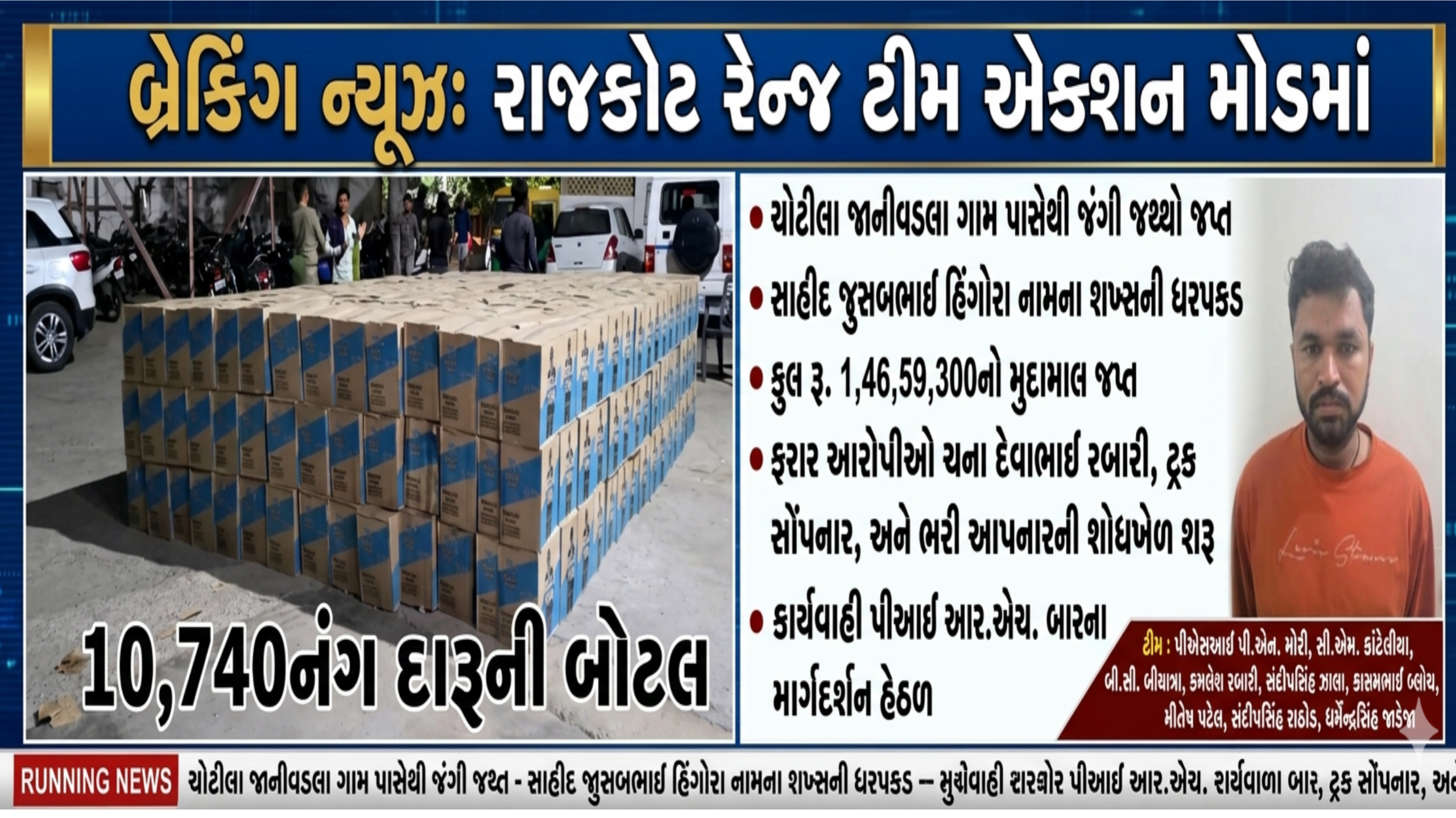 રાજકોટ રેન્જ પોલીસ દ્વારા ગેરકાયદેસર દારૂના વેપાર સામે મોટી કાર્યવાહી કરવામાં આવી છે. રાજકોટ-ચોટીલા માર્ગ પર જાનીવડલા ગામના પાટીયા પાસે પોલીસ ટીમે દરોડો પાડી કુલ 10,740 નંગ દારૂની બોટલ સાથે અંદાજિત રૂ. 1,46,59,300નો મુદ્દામાલ કબજે કર્યો છે.